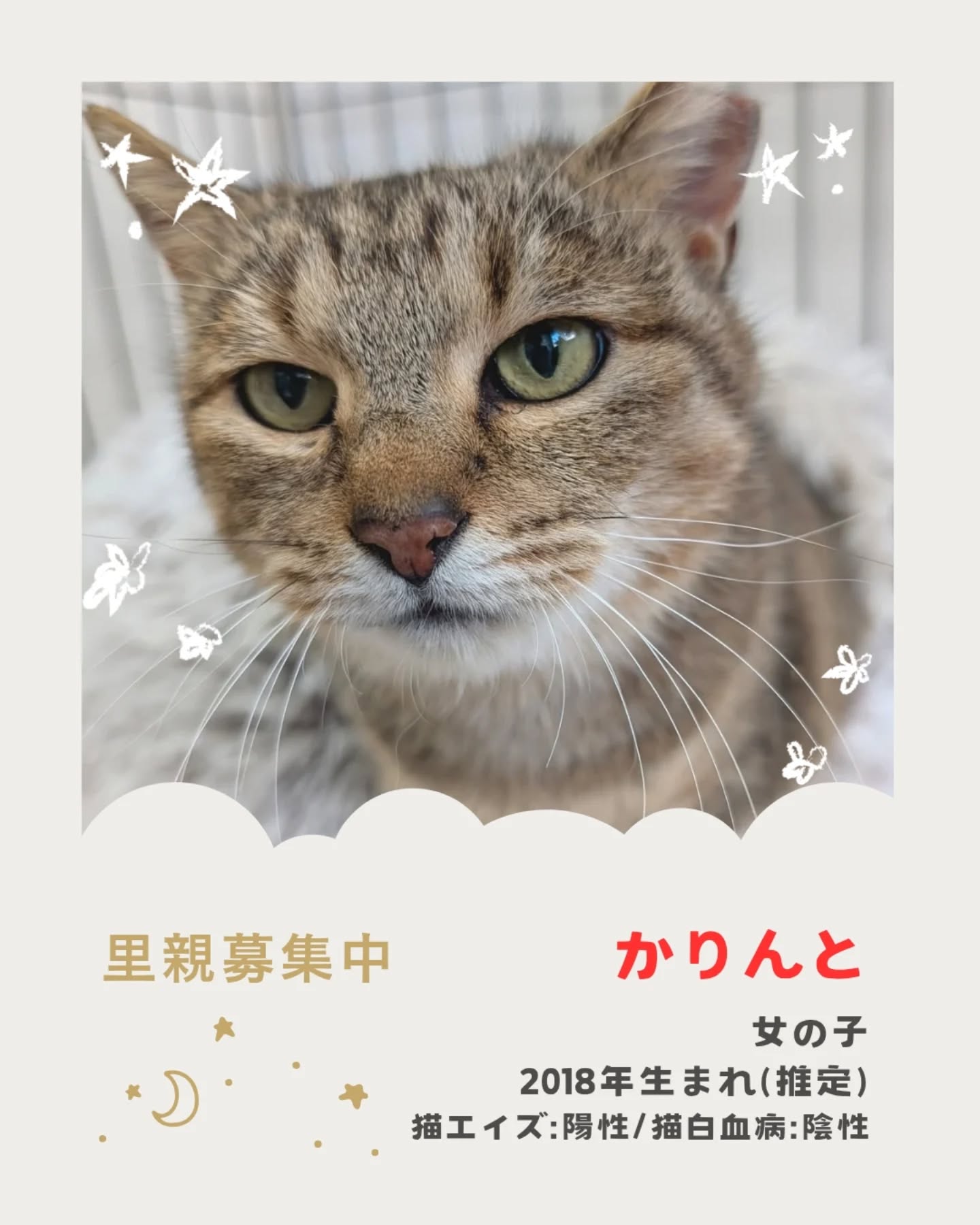 - シニア期に片足を突っ込みましたがまだまだ若さ溢れるかりんちゃん。一番奥のお部屋の一番奥のケージにいますので、シェルターにお越しの際にはぜひご指名ください!お腹を見せて甘えてくれますよ。