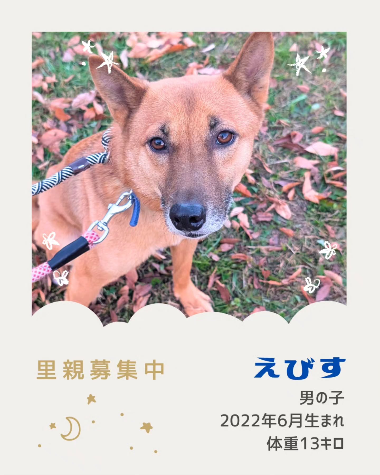 小柄で立ち耳、くるんと巻いたフサフサしっぽにキレイな茶色!後ろ姿が柴犬そっくりなえびす。